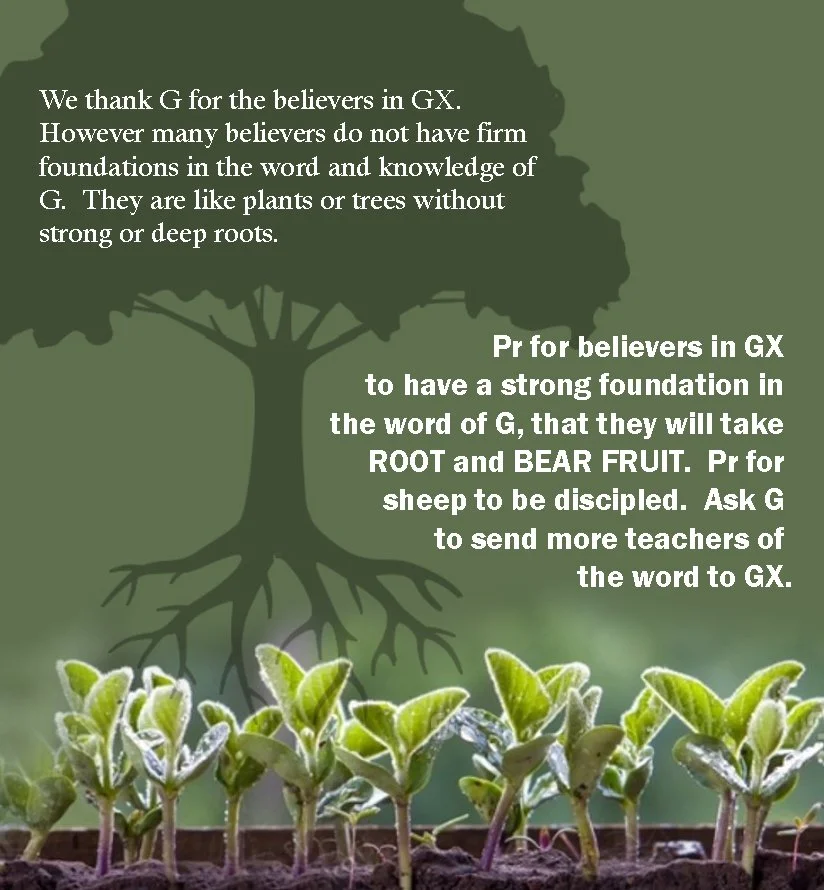 Pr for believers in GX to have a strong foundation in the word of G, that they will take ROOT and BEAR FRUIT. Pray for sheep to be discipled. Ask G to send more teachers of the word to GX.